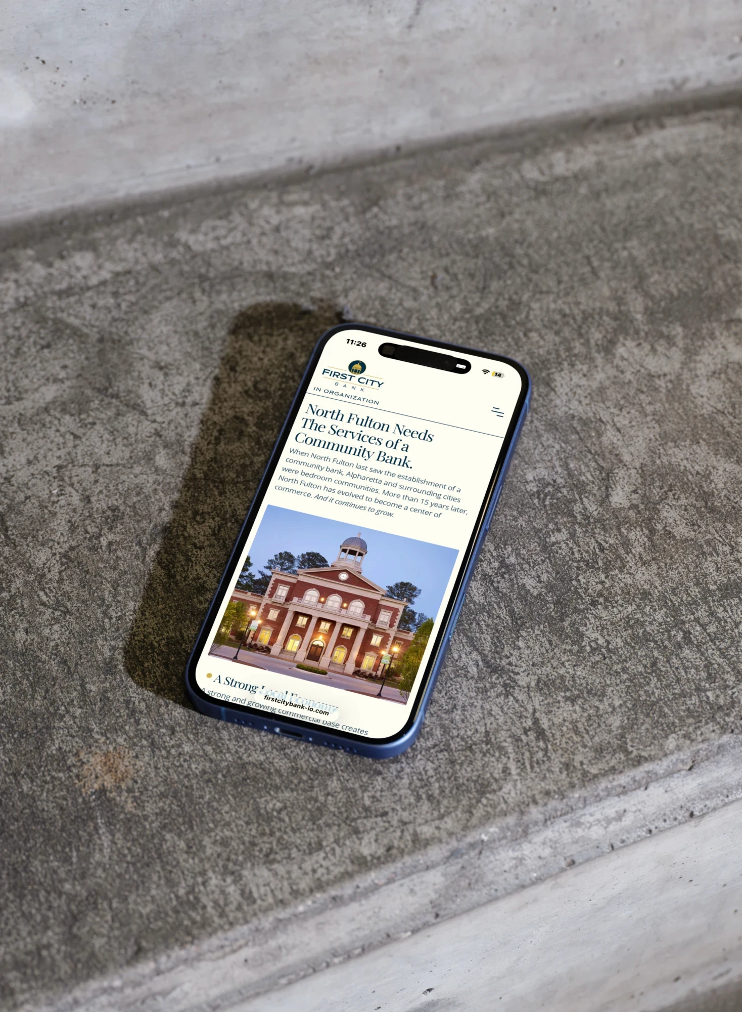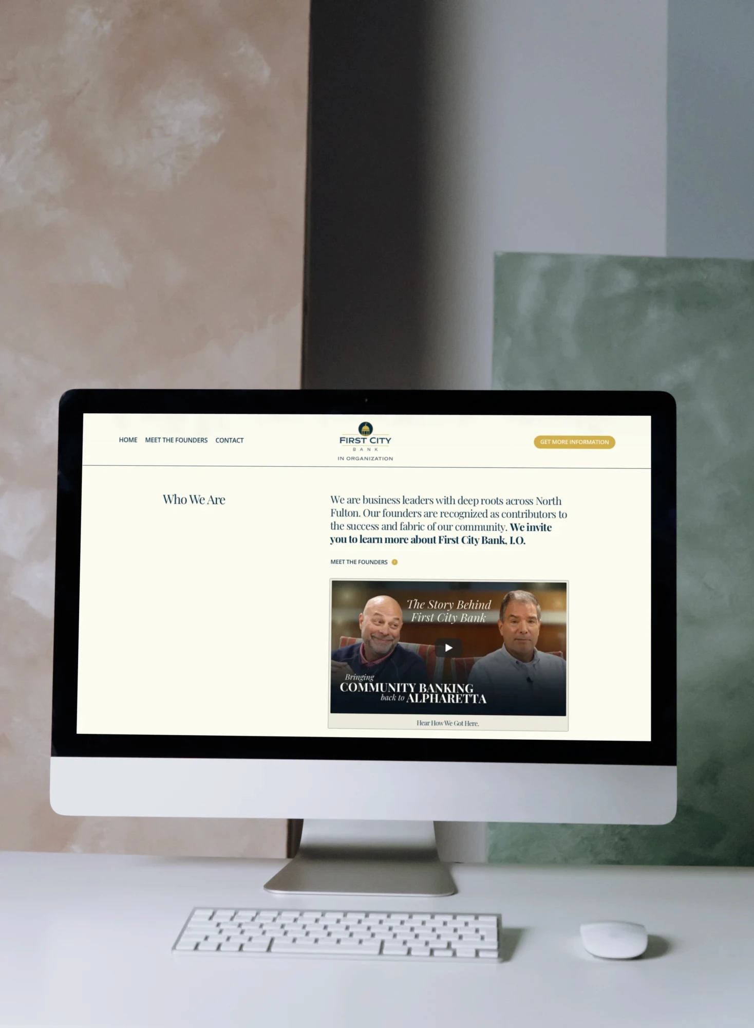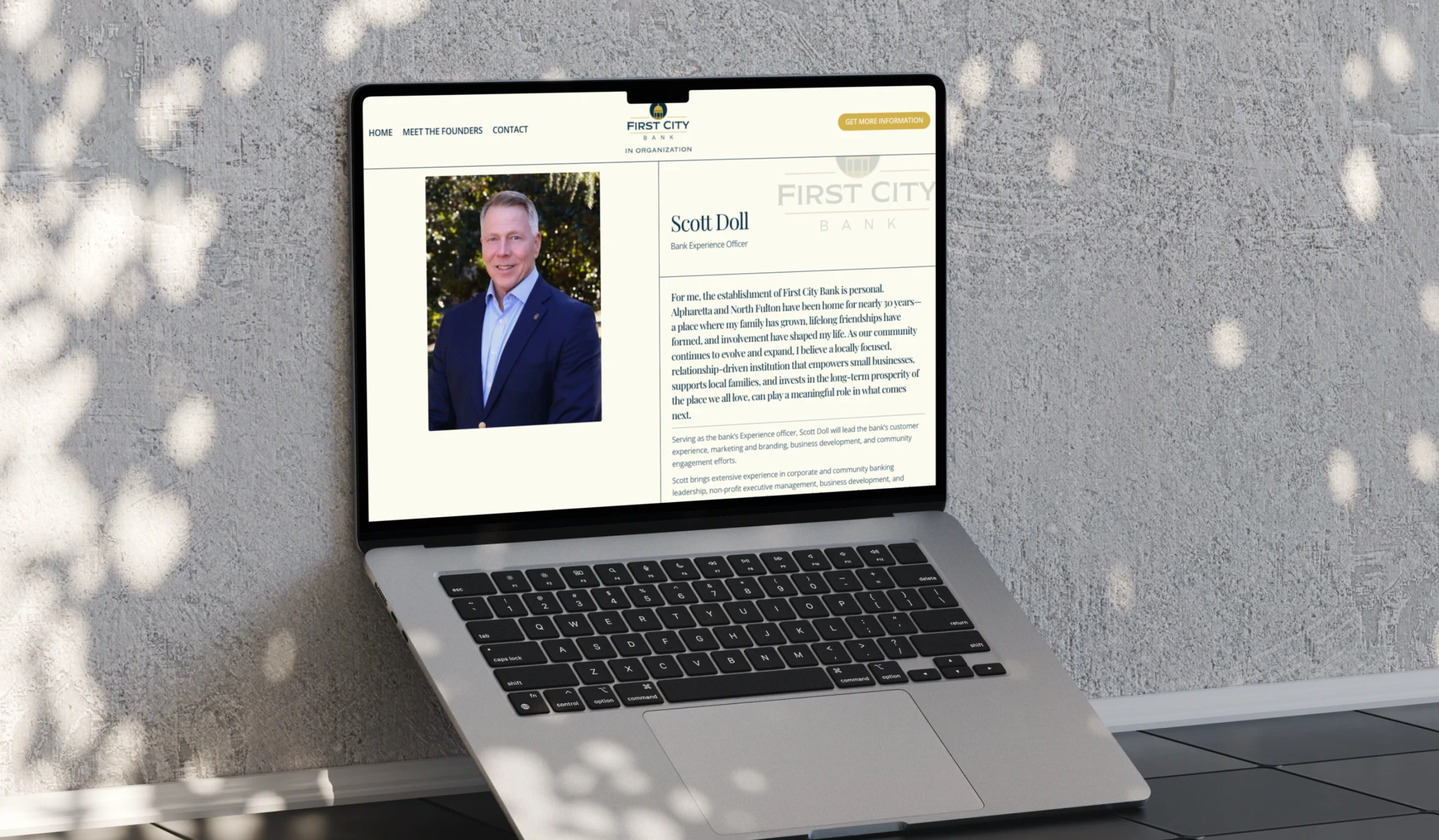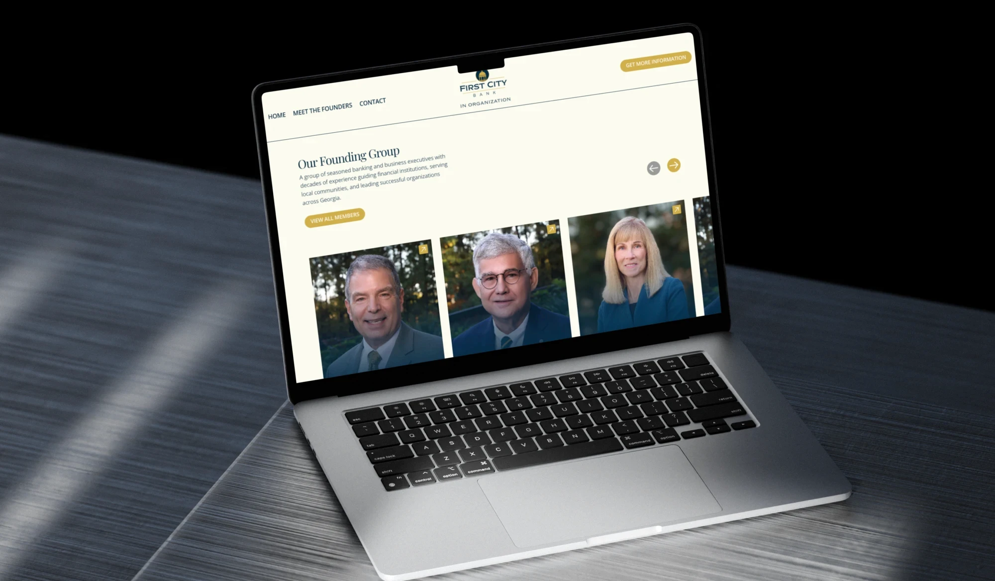 First City Bank is a community bank built to serve local businesses and families the way large institutions no longer do. The site's goal: build investor confidence by spotlighting the organizing team, communicating a clear market opportunity, and making the case for community banking over national banks.